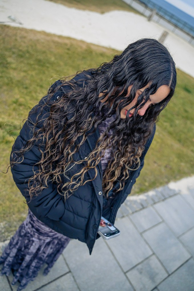 A floridian freezing up in northern weather to the point where her coat is a glove